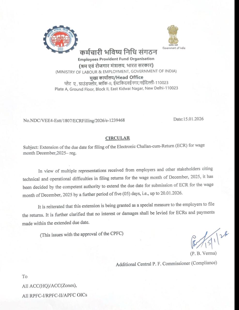 Extension of the due date for filing of the Electronic Challan-cum-Return (ECR) for wage month December, 2025 - New Delhi - 15-1-2025